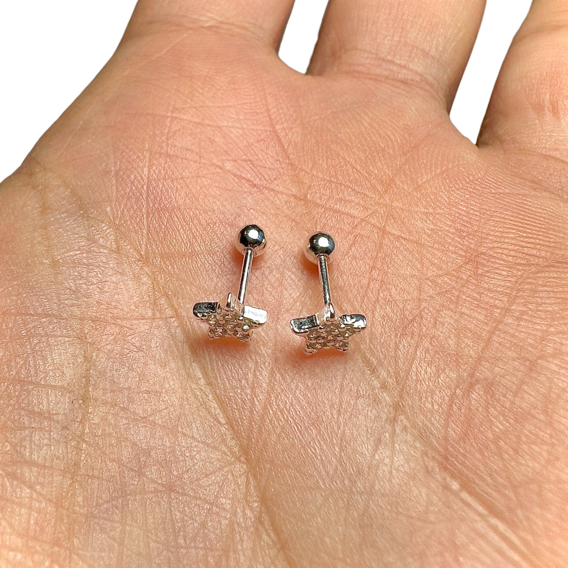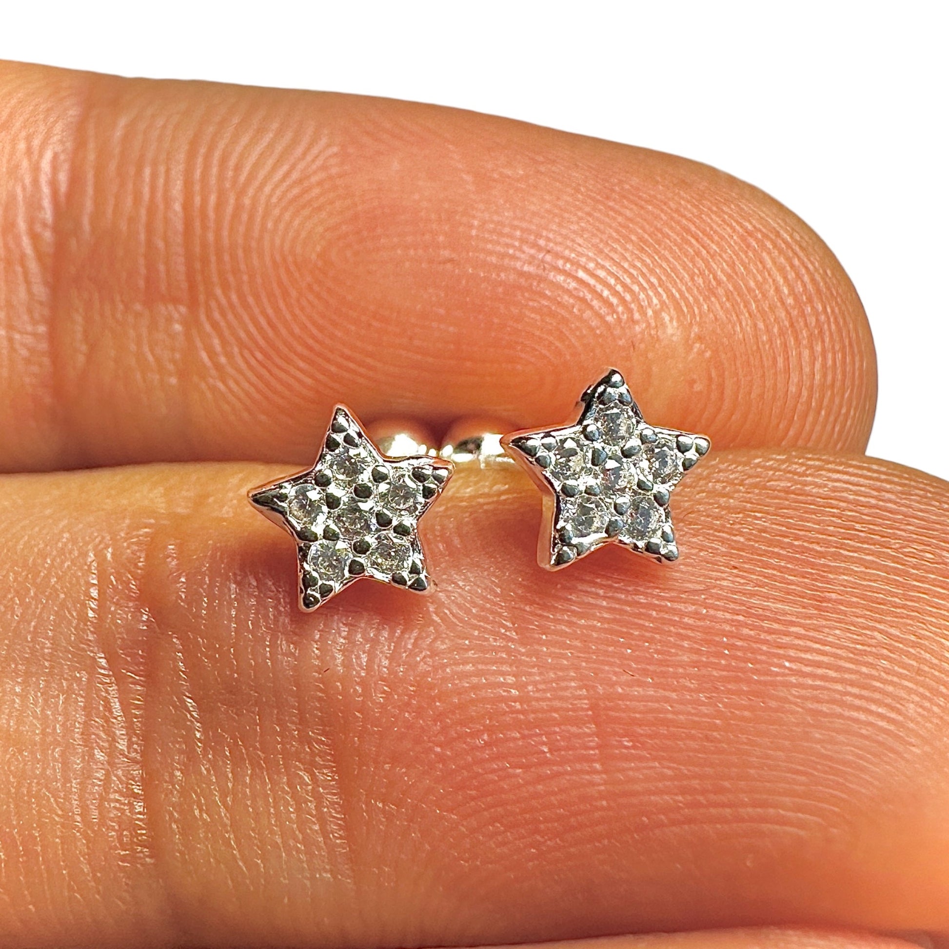 Minimalist star stud earrings with bright clear CZ sparkle, perfect for everyday wear, stacking, and second piercings.